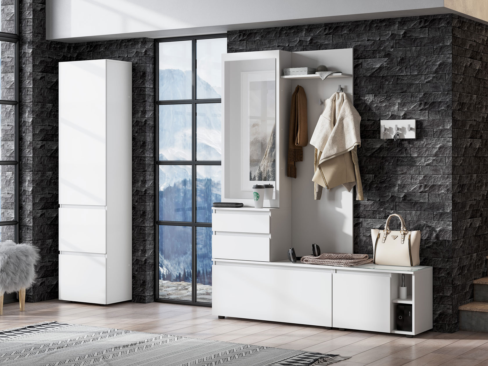 Лаконичные фасады с интегрированными ручками не перегружают интерьер. Благодаря разнообразию мест для хранения можно распределить вещи по категориям: сезонная и верхняя одежда, обувь, сумки, аксессуары. Открытая вешалка с крючками добавит удобства. Зеркальная дверца на одном из фасадов визуально расширит пространство и позволит оценить внешний вид.