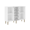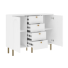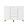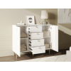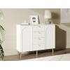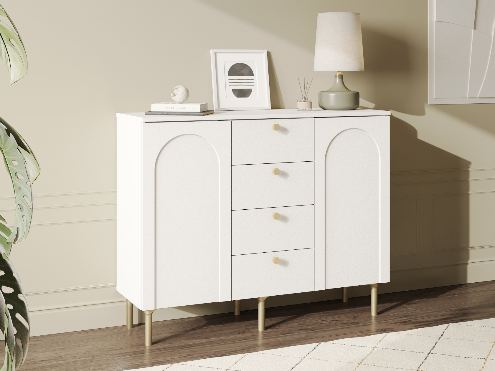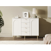 Выдвижные ящики позволят аккуратно распределить белье и аксессуары, а просторные боковые секции обеспечат место для более крупных предметов. В дизайне сделан акцент на плавные линии фрезеровки и фурнитуру в золотом оттенке. Высокие ножки добавляют мебели визуальную легкость.