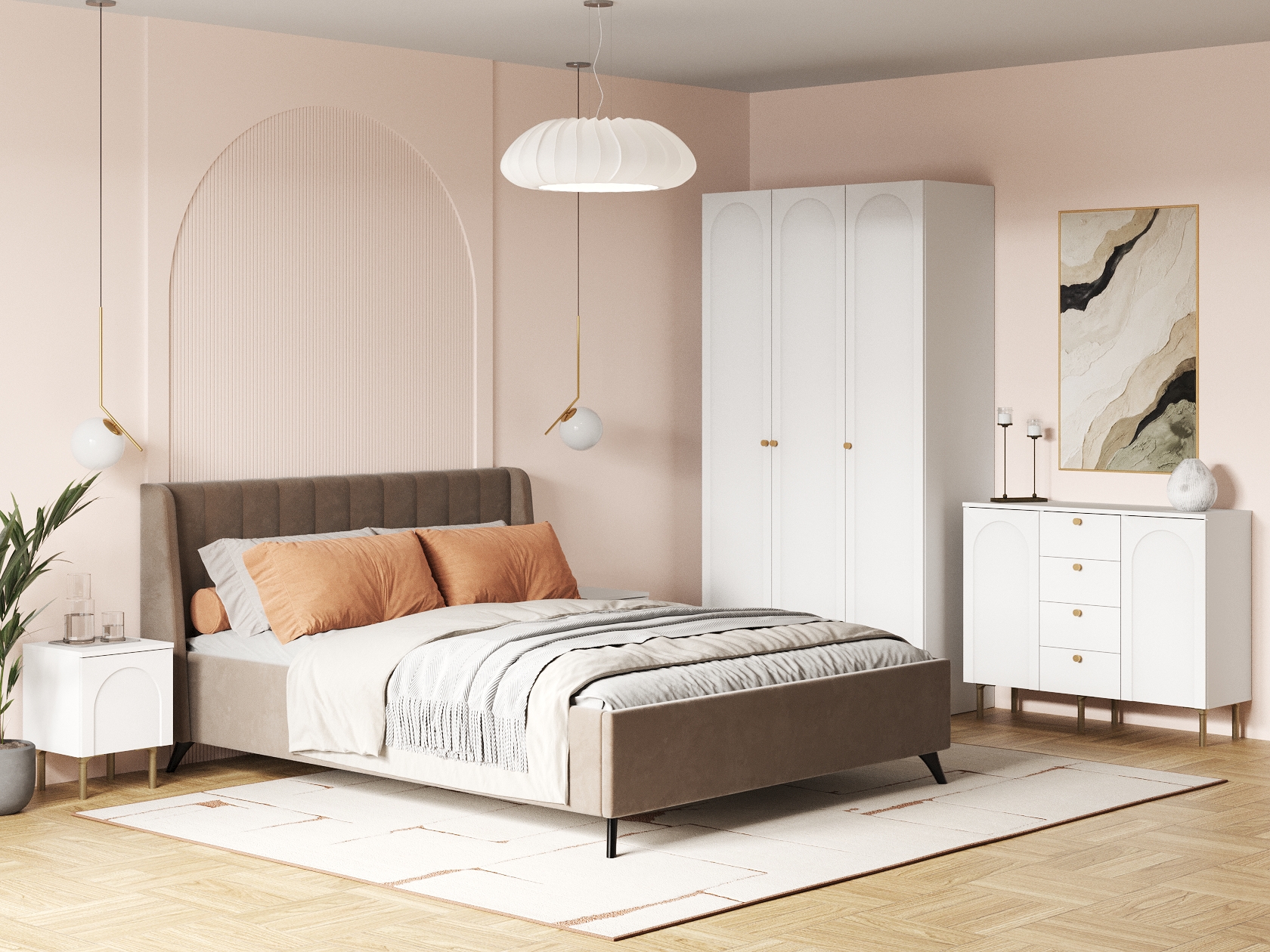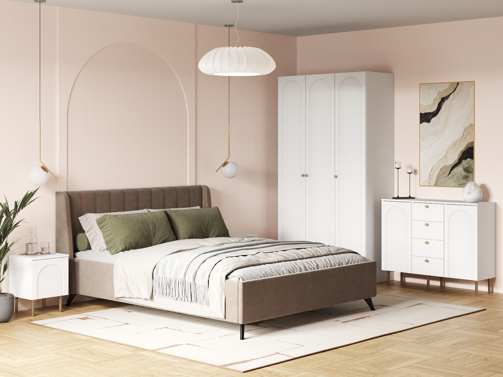 Высокая мягкая спинка с декоративной строчкой придает кровати особый уют. В наборе предусмотрено несколько вариантов для хранения вещей, при этом мебель не перегружает обстановку благодаря высоким ножкам, матовым фасадам и лаконичной фурнитуре.
